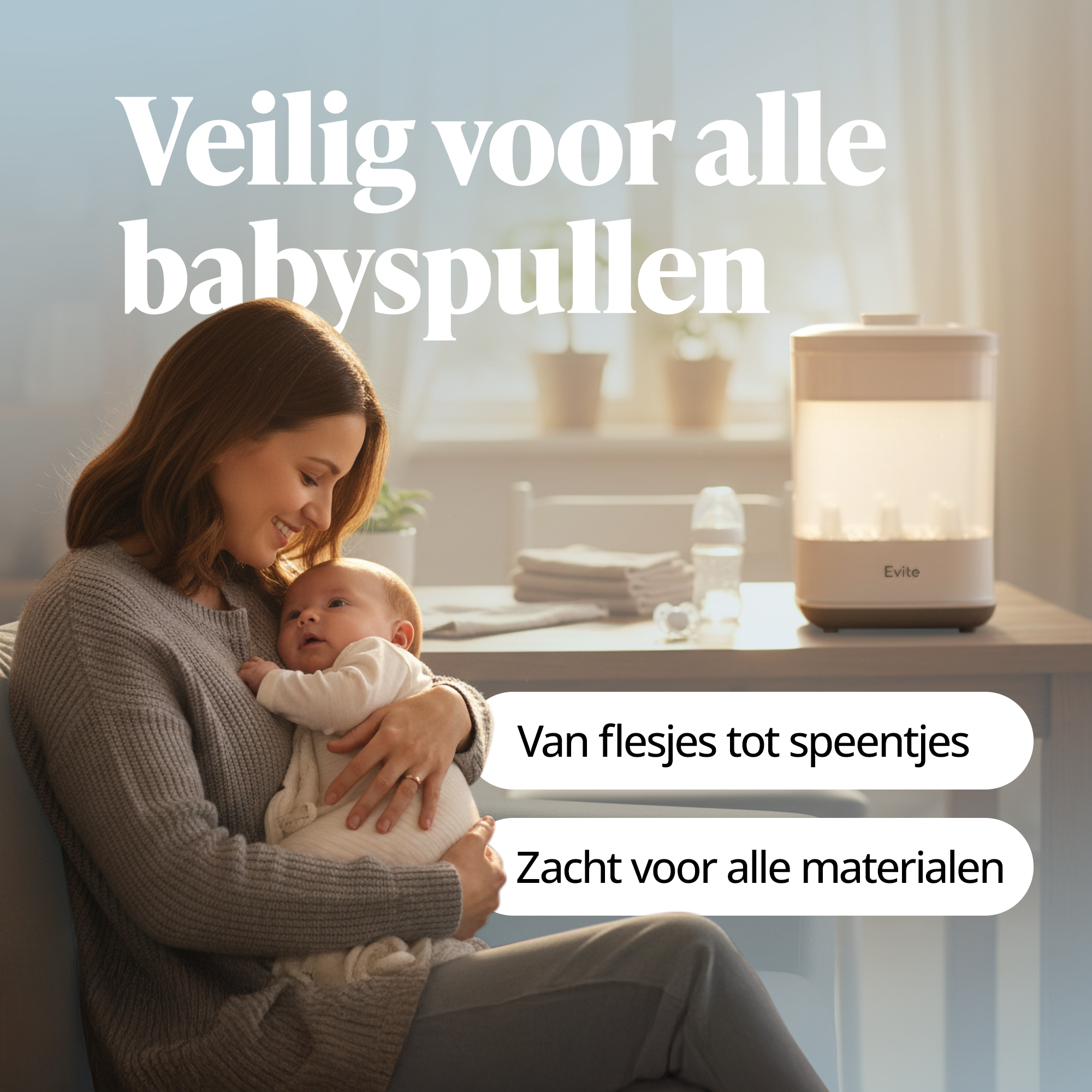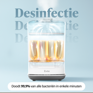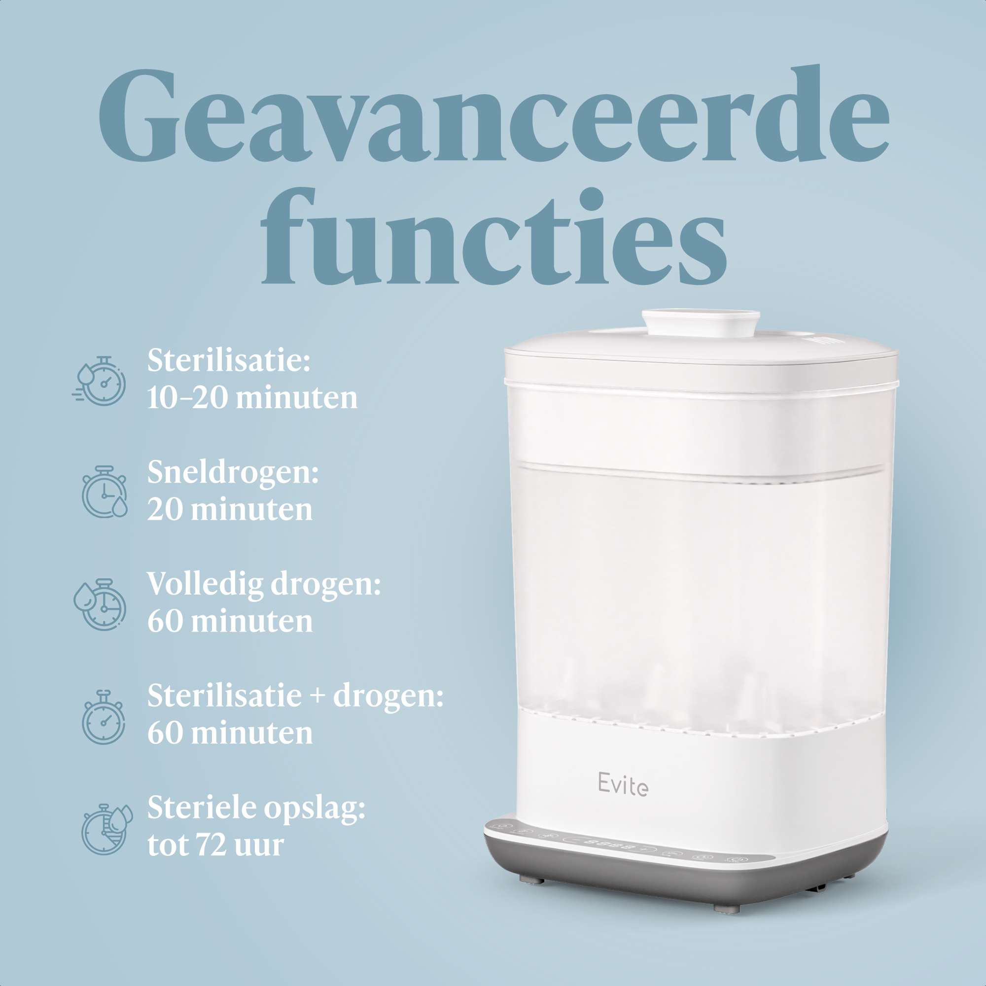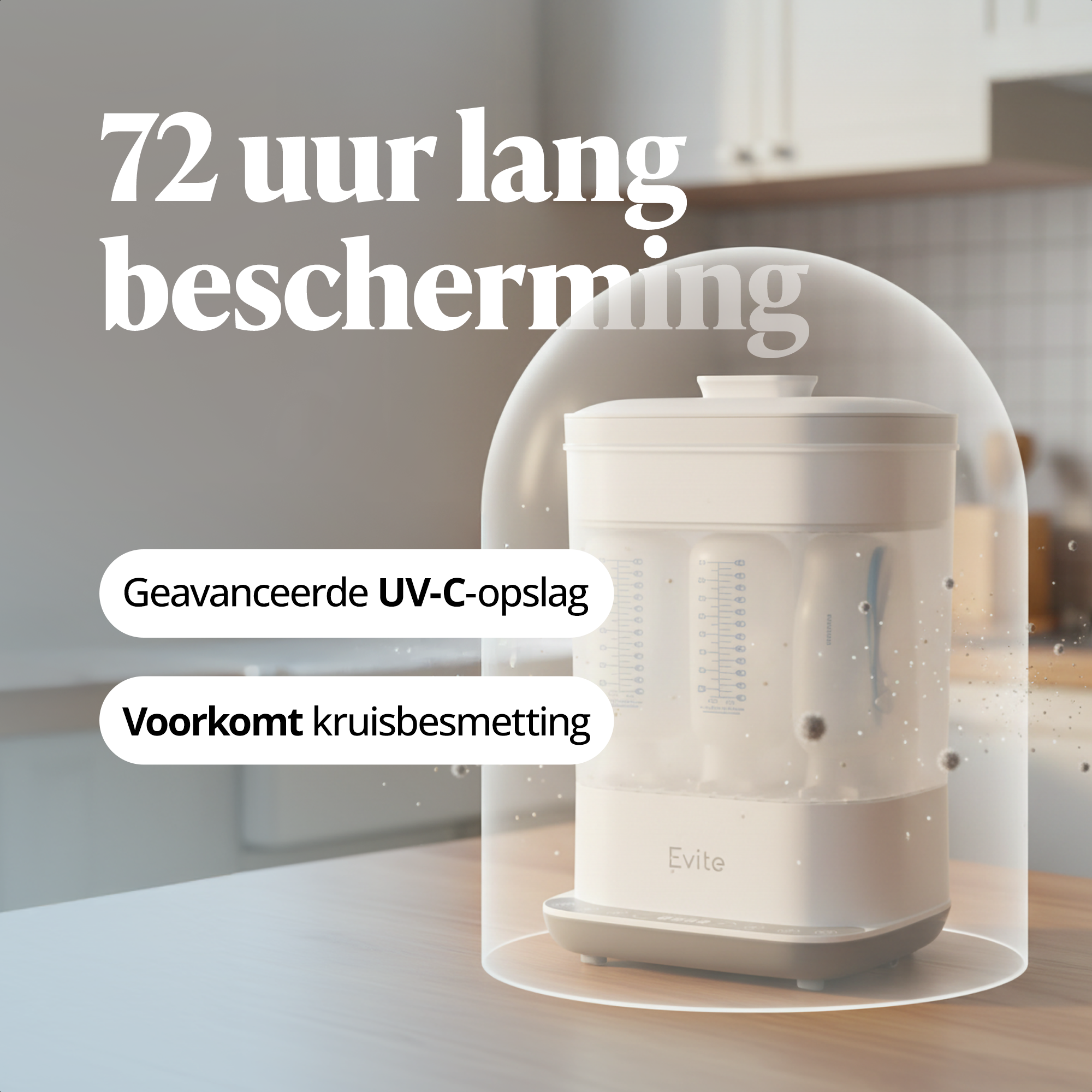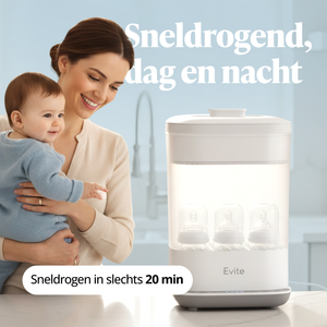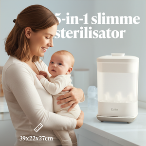 De Evite 5-in-1 Flessensterilisator combineert vijf essentiële functies in één krachtig systeem, speciaal ontworpen voor moderne ouders die geen concessies willen doen aan veiligheid of gemak.