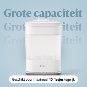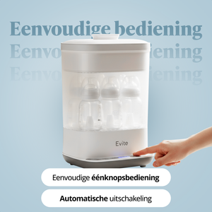 De Evite 5-in-1 Flessensterilisator zorgt ervoor dat babyflessen en accessoires altijd schoon, droog en direct klaar voor gebruik zijn.